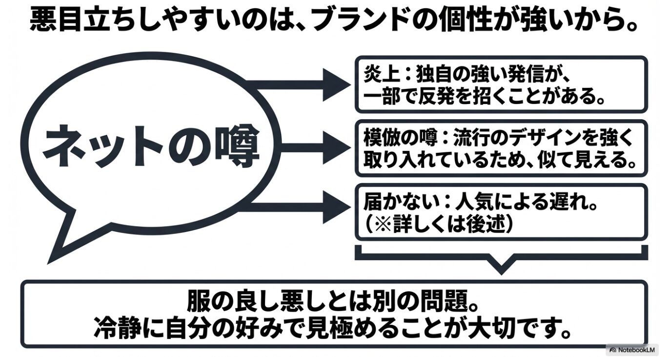 そのため、ただ「服が良い・悪い」で判断するより、ブランドの世界観ごと受け入れられるかを見たほうが実態に近いかなと思います。