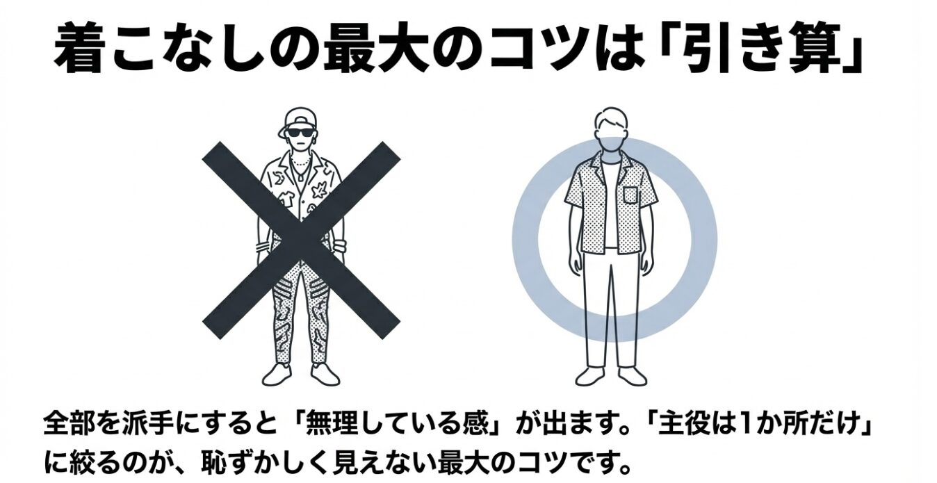 着こなしで迷ったら、主役は1か所に絞るのが基本です。服、靴、アクセ、ヘアの全部を強くしないほうがまとまりやすいです。