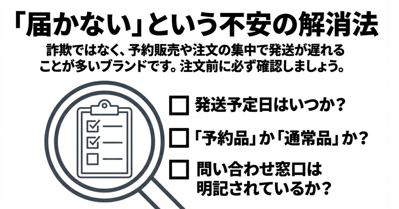 発送予定、特定商取引法に基づく表記、問い合わせ手段、予約品か通常品か、この4点を確認しておくと不安はかなり減ります。急ぎの人ほどここを飛ばさないことが大切です。