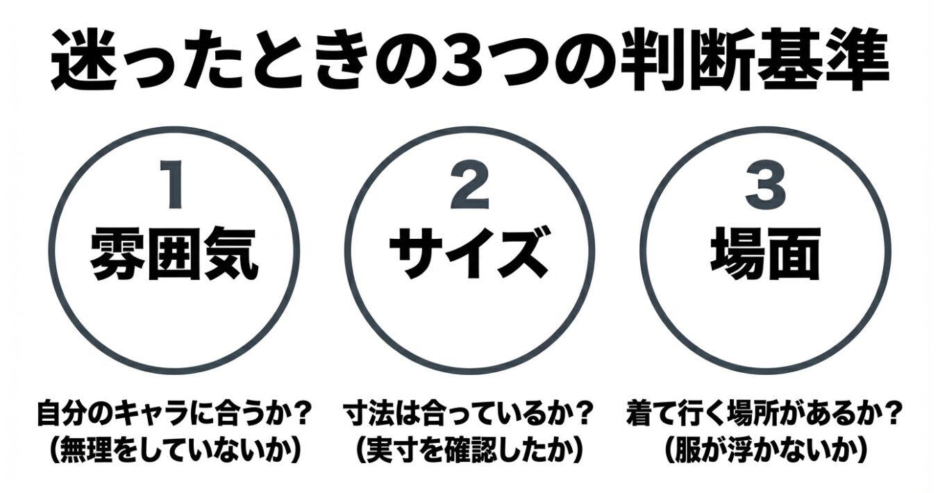 迷ったときの判断基準は3つです。自分の雰囲気に合うか、サイズが合うか、着る場面があるか。この3点が揃えば、ベリンダは十分アリだと思います。