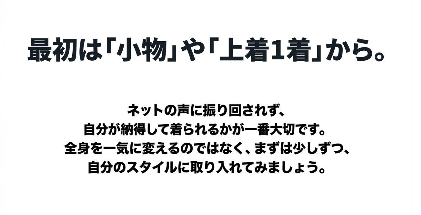 「恥ずかしいかも」と不安な人ほど、まずは全身でいきなり固めず、小物かトップス1点から試すほうが失敗しにくいです。