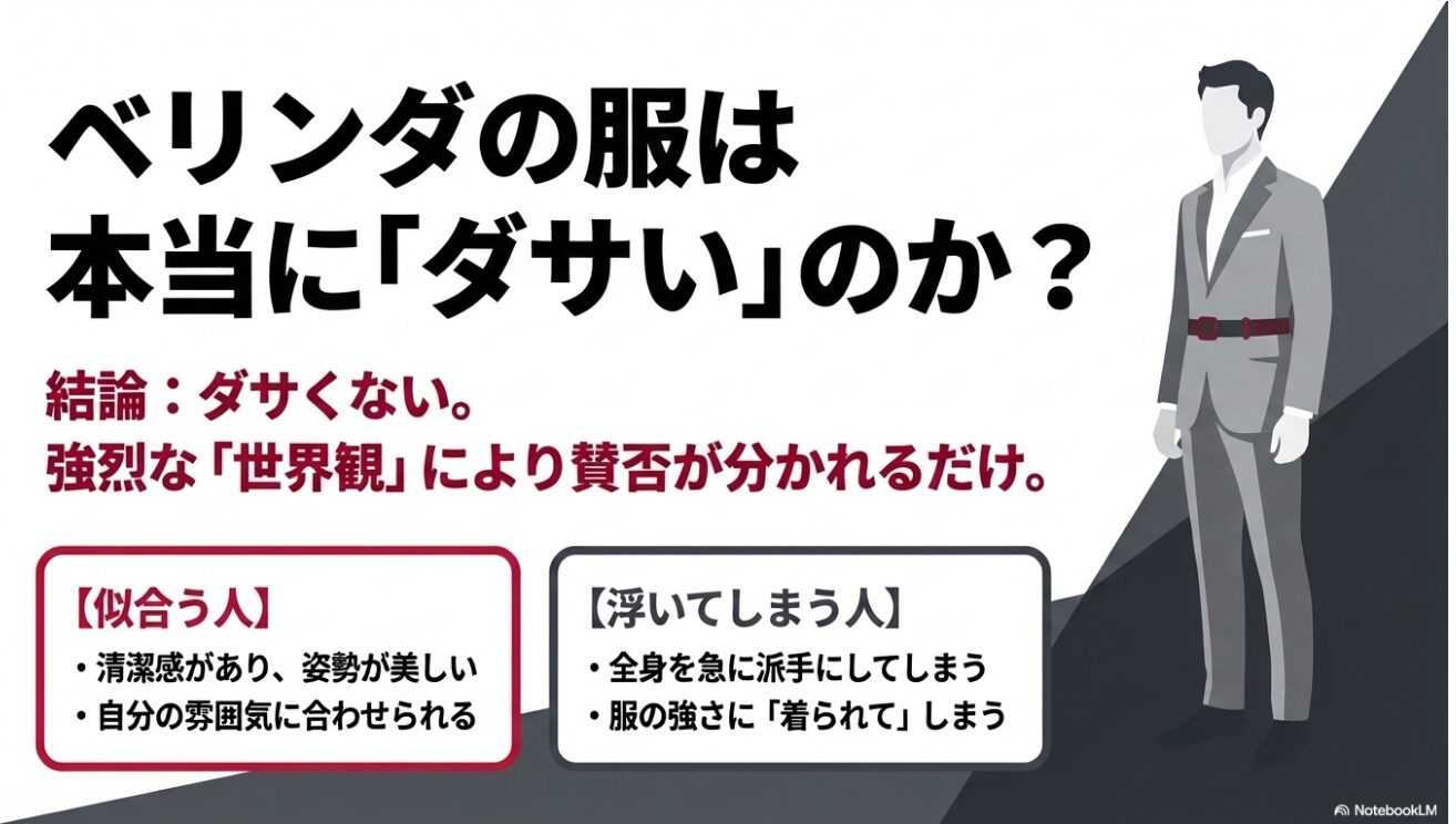 逆に、清潔感があってサイズ感も整っていて、本人のキャラと噛み合っていればちゃんと成立します。だから、ベリンダが恥ずかしいブランドというより、着こなしの難易度がやや高めなブランドと考えたほうが近いです。最初は一点使いから入るのが安心かなと思います。