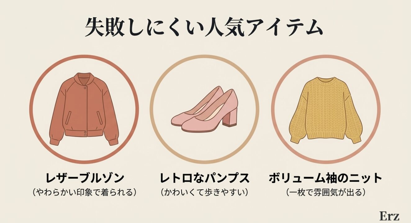 Erzで注目されやすい人気アイテムは、見た目がかわいいだけでなく、着たときのバランスが取りやすいものです。代表的なのは、レザーブルゾン、ビンテージパンプス、ボリュームスリーブ系のニット、ハイウエストのワイドパンツあたりですね。いずれも、写真映えだけで終わらず、実際のコーデに落とし込みやすいところが支持されやすい理由だと思います。