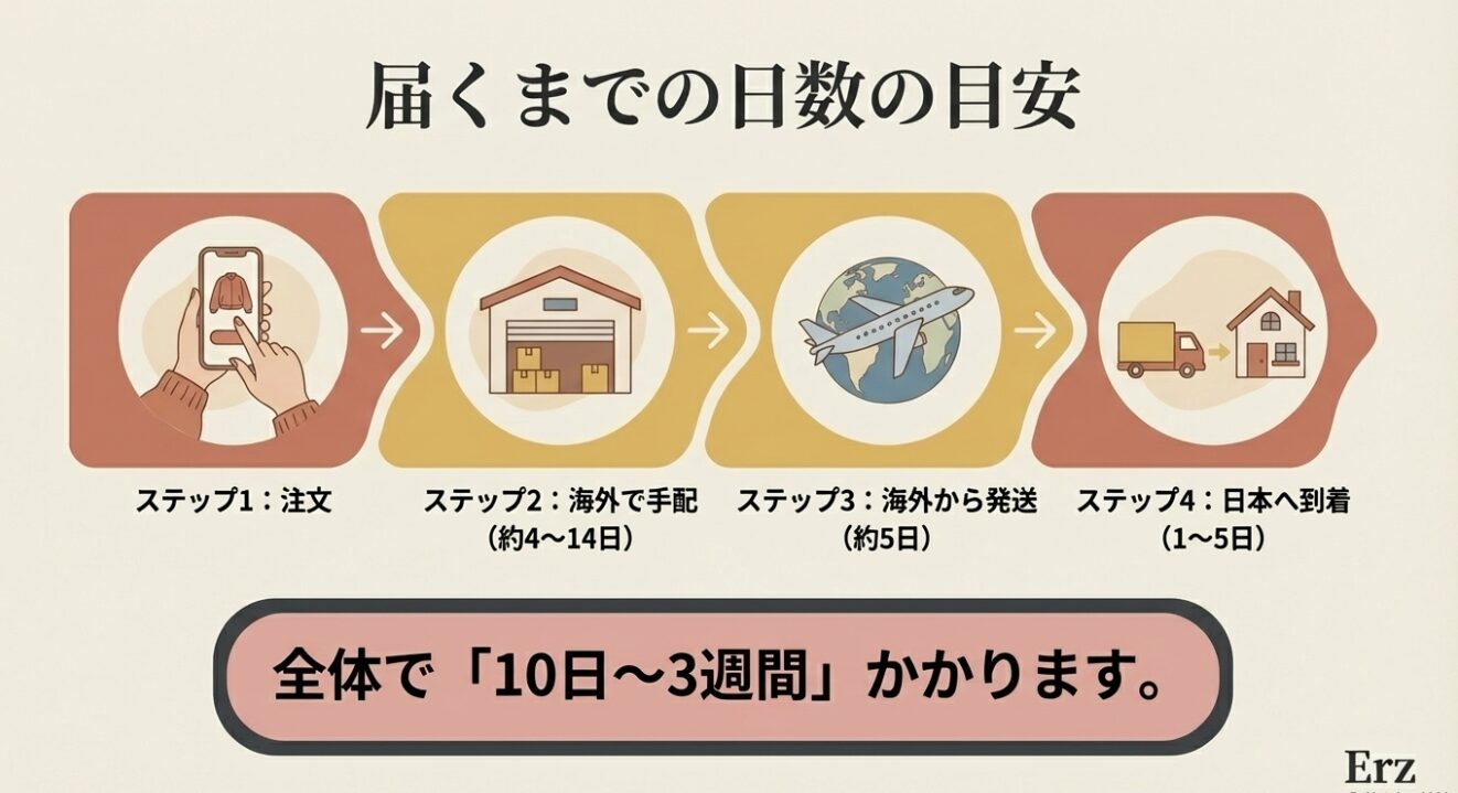 Erzで特に不安になりやすいのが、「届かない」というワードです。ただ、ここは詐欺的に届かないというより、海外からの取り寄せ型であることが大きいです。注文後に海外で商品を手配し、検品や国際配送を経て日本国内へ届く流れなので、国内在庫をすぐ出荷する通販とは前提がかなり違います。国内の大手モール感覚で考えると、どうしても遅く感じやすいんですよね。