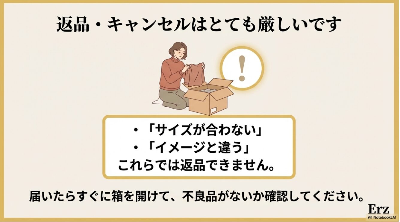 Erzで特に大事なのが、返品やキャンセル条件です。ここはかなり厳しめに見ておいたほうがいいです。基本的には、自己都合のキャンセルや返品は難しいと考えておくのが無難ですね。かわいい服を見ると気分が上がって勢いで買いたくなりますが、この部分だけは先に読んでおかないと後でかなり困りやすいポイントです。