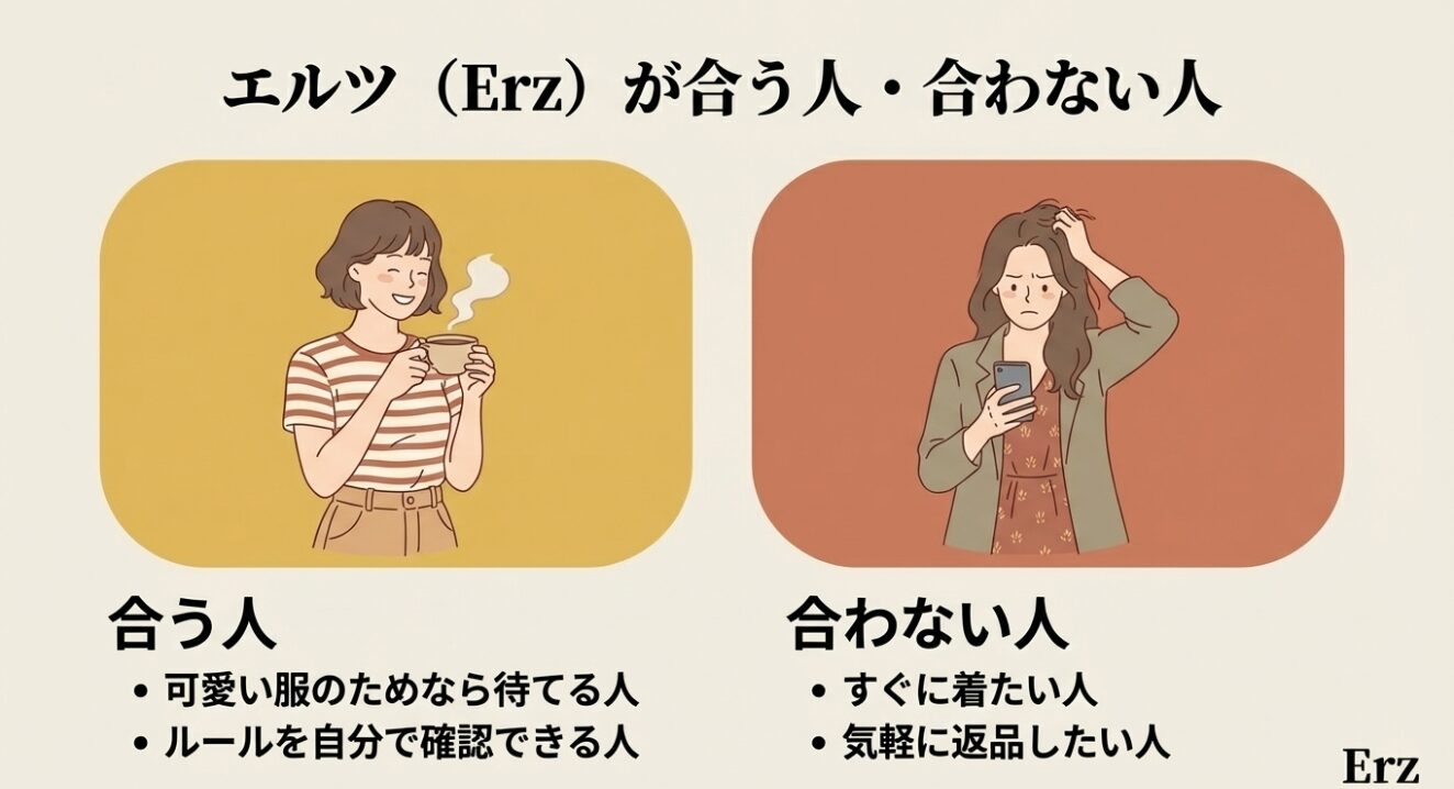 もし、レトロカジュアルや大人ガーリーな雰囲気が好きで、少し待ってでも気に入った一着を選びたいなら、Erzは十分候補になるブランドです。逆に、すぐ届いて、返品も柔軟で、実店舗感覚で気軽に試したい方には、少し相性を見たほうがいいかもしれません。通販に何を求めるかで、向き不向きがはっきりしやすいブランドとも言えそうです。