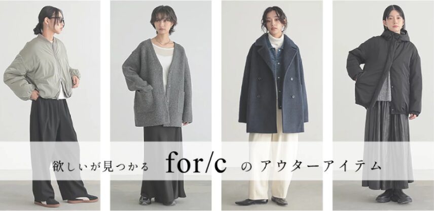 さらに最近では、ユニセックスラインである「for/c and(フォーシーアンド)」も展開が始まりました。「一緒に、楽しく、大切にしたい」をコンセプトに、パートナーと共有できるサイズ感やデザインの服が登場しています。