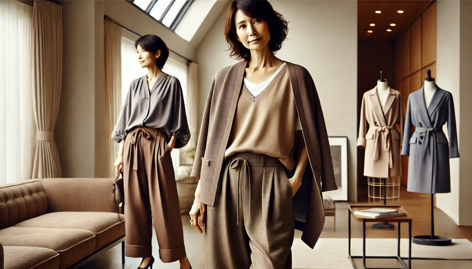- 深めのタックパンツ: お腹周りにゆとりを持たせつつ、縦のラインを強調してすっきり見せる視覚効果があります。
