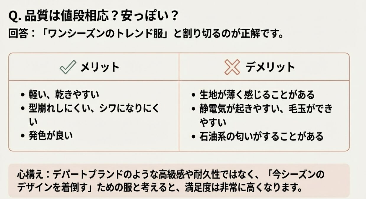 私自身、新しいブランドの服を買うときは、タグの裏側まで気になってしまうタイプなので、みなさんが抱く「安すぎて逆に怖い」という感覚、すごくよく分かります。
