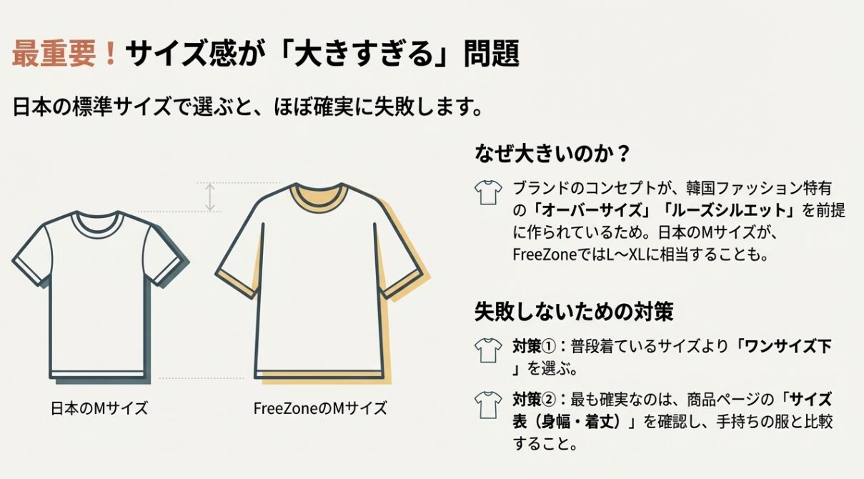 これは、単なるサイズ設定のミスではありません。ブランドのコンセプト自体が、韓国ファッション特有の「オーバーサイズ」「ルーズシルエット」を前提に設計されているからです。日本の一般的なブランド(例えばユニクロや無印良品)の「ジャストサイズ」の感覚で選ぶと、1〜2サイズ大きく感じることがあります。