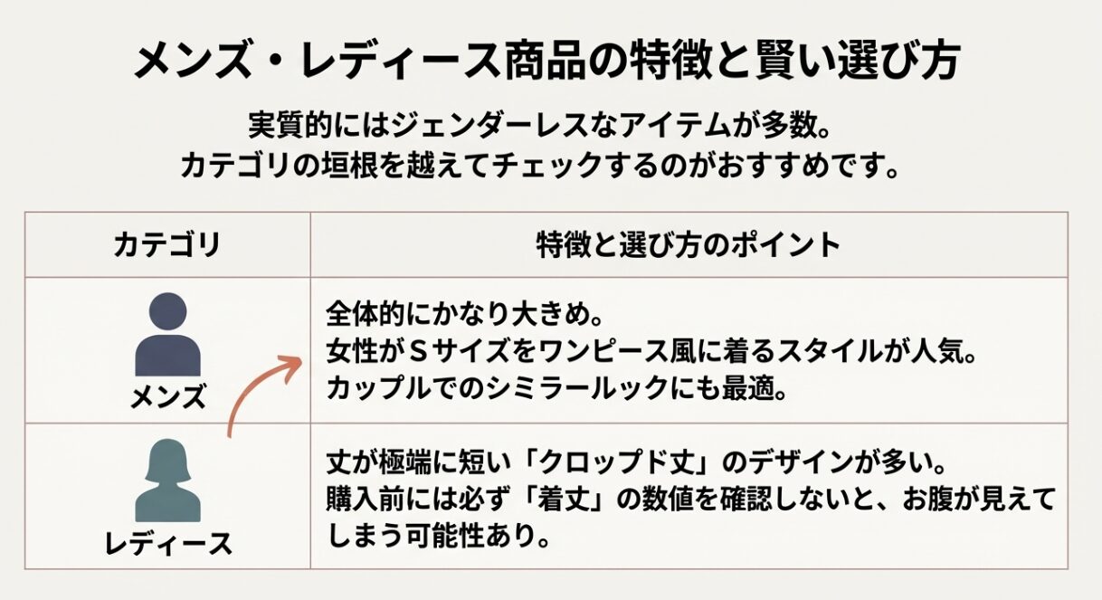 | レディース | 短丈(クロップド)や変形デザインが多い。露出度が高めな場合があるので、モデル着用写真をよく確認する。 |
