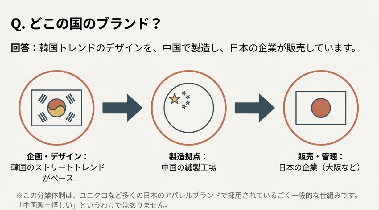 実態を詳しく調査してみたところ、商品の品質表示タグやオンライン上の説明には、ほとんどのケースで「原産国:中国(Made in China)」と記載されています。つまり、企画やデザインのルーツは韓国トレンドやストリートカルチャーにあるものの、実際の製造拠点は中国の縫製工場にあるということです。