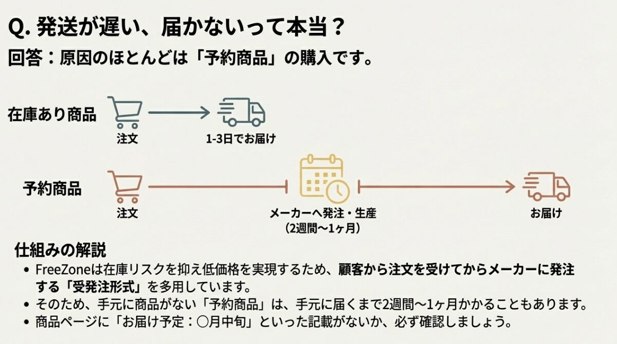 FreeZoneのような低価格ブランドは、在庫リスクを減らすために、注文を受けてからメーカーに発注したり、海外からまとめて輸入したりする「受発注形式」をとることがあります。この場合、手元に届くまで2週間〜1ヶ月近くかかることも珍しくありません。「在庫があると思って買ったら、実は予約商品だった」というパターンが、発送遅延トラブルの正体のほとんどです。