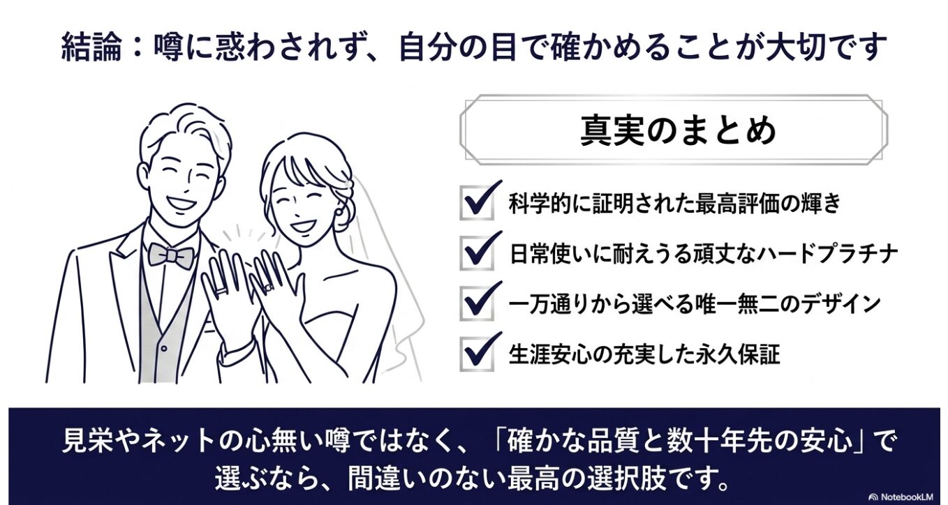 周りの目やネットの心無い噂に決して惑わされることなく、ぜひご自身の目で実際の輝きや着け心地を確かめてみてください。