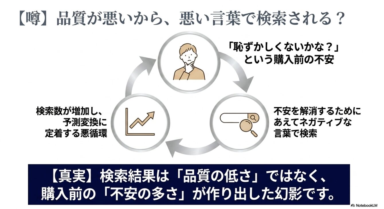 購入前の不安がネガティブ検索を生み出す悪循環の図解
