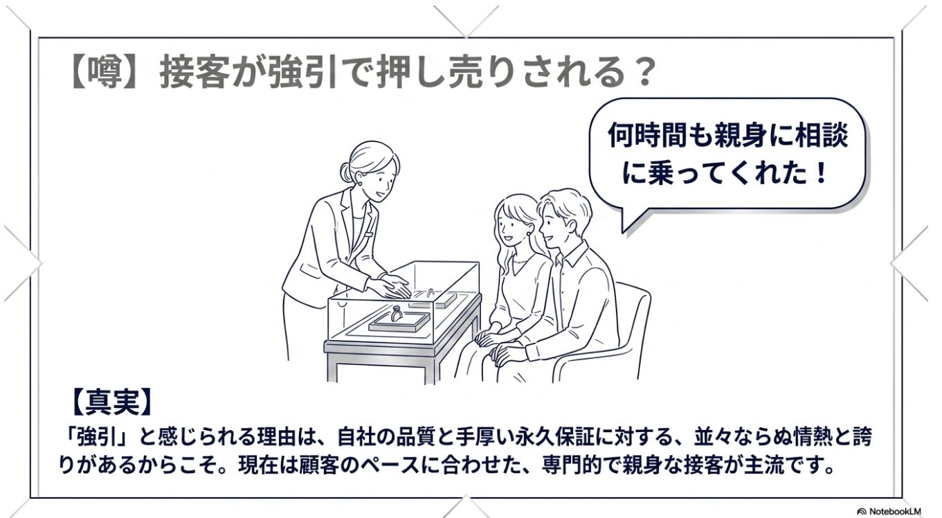 しかし、直近の口コミや評判を精査すると、「何時間も親身になって相談に乗ってくれた」「専門的な知識で丁寧に教えてくれて安心した」というポジティブな声が大多数を占めるようになっており、ブランド側も顧客のペースに合わせた接客へと進化していることが伺えます。