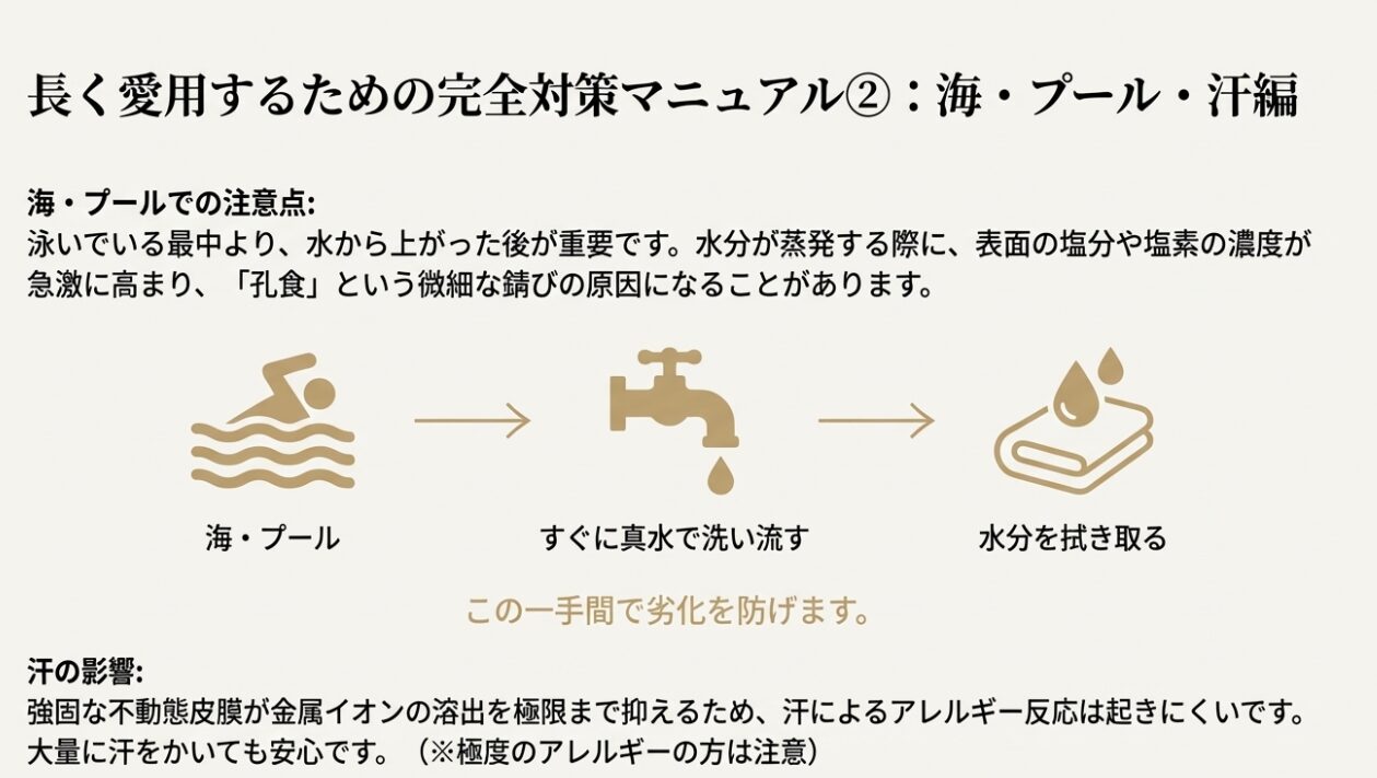 夏のリゾートシーン、海やプールでもアクセサリーを楽しみたいですよね。サージカルステンレス316Lは「Marine Grade(マリングレード)」とも呼ばれ、海水への耐性も比較的高い素材ですが、完全に無敵ではありません。ここでの最大の敵は「乾燥による濃縮」です。