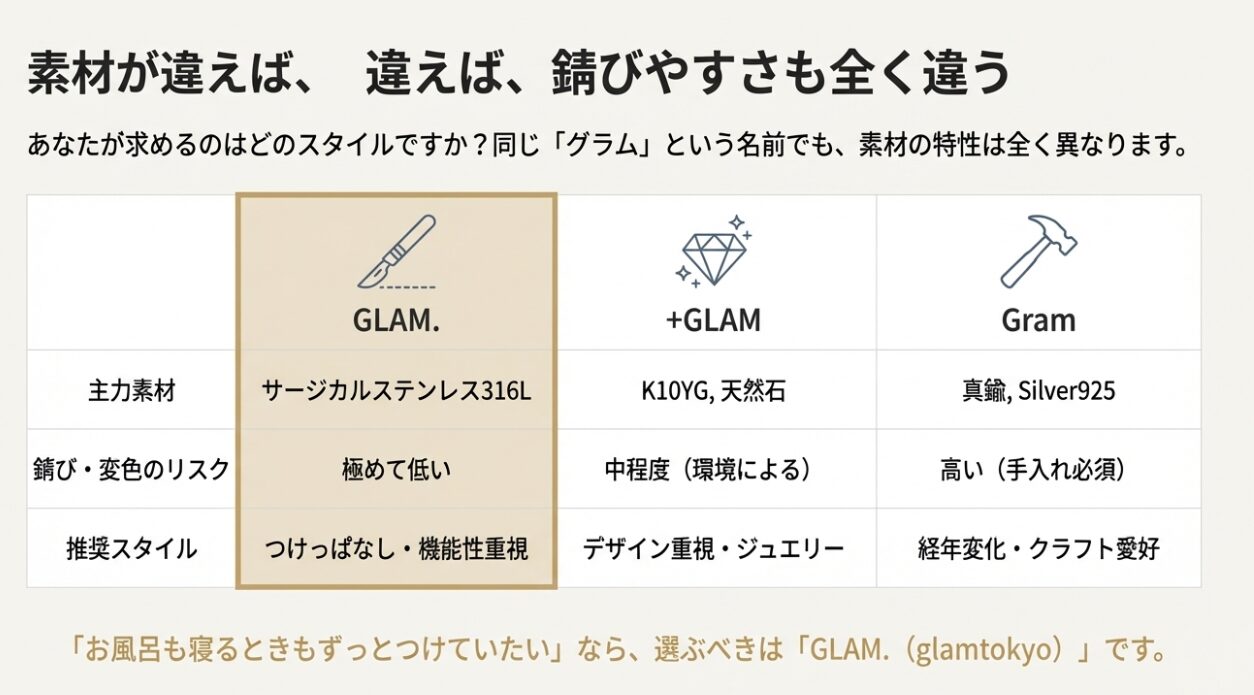 GLAM.(サージカルステンレス)、+GLAM(K10)、Gram(真鍮)の主力素材、錆びリスク、推奨スタイルをまとめた比較表