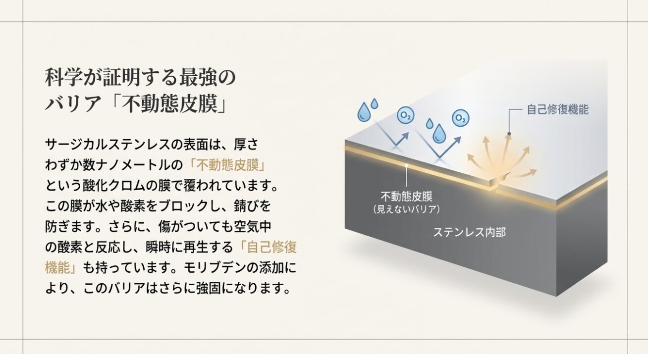 一般的なステンレス(スプーンやフォークに使われるSUS304など)と、サージカルステンレス(SUS316L)の決定的な違いは、「モリブデン」というレアメタルが添加されているかどうかにあります。このモリブデンが加わることで、ステンレス表面に形成される「不動態皮膜(ふどうたいひまく)」という保護バリアが劇的に強化されます。