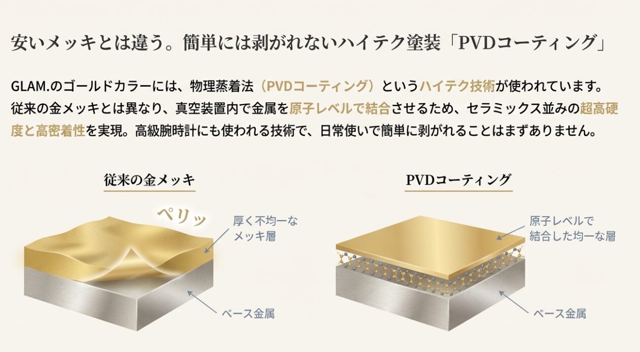 GLAM.の魅力の一つは、ゴールドやピンクゴールドといったカラーバリエーションの豊富さです。しかし、ステンレス自体の色は銀色(シルバー色)ですので、これらの色は表面処理によって着色されています。「メッキはすぐに剥がれて安っぽくなるから嫌だ」と敬遠される方もいるでしょう。