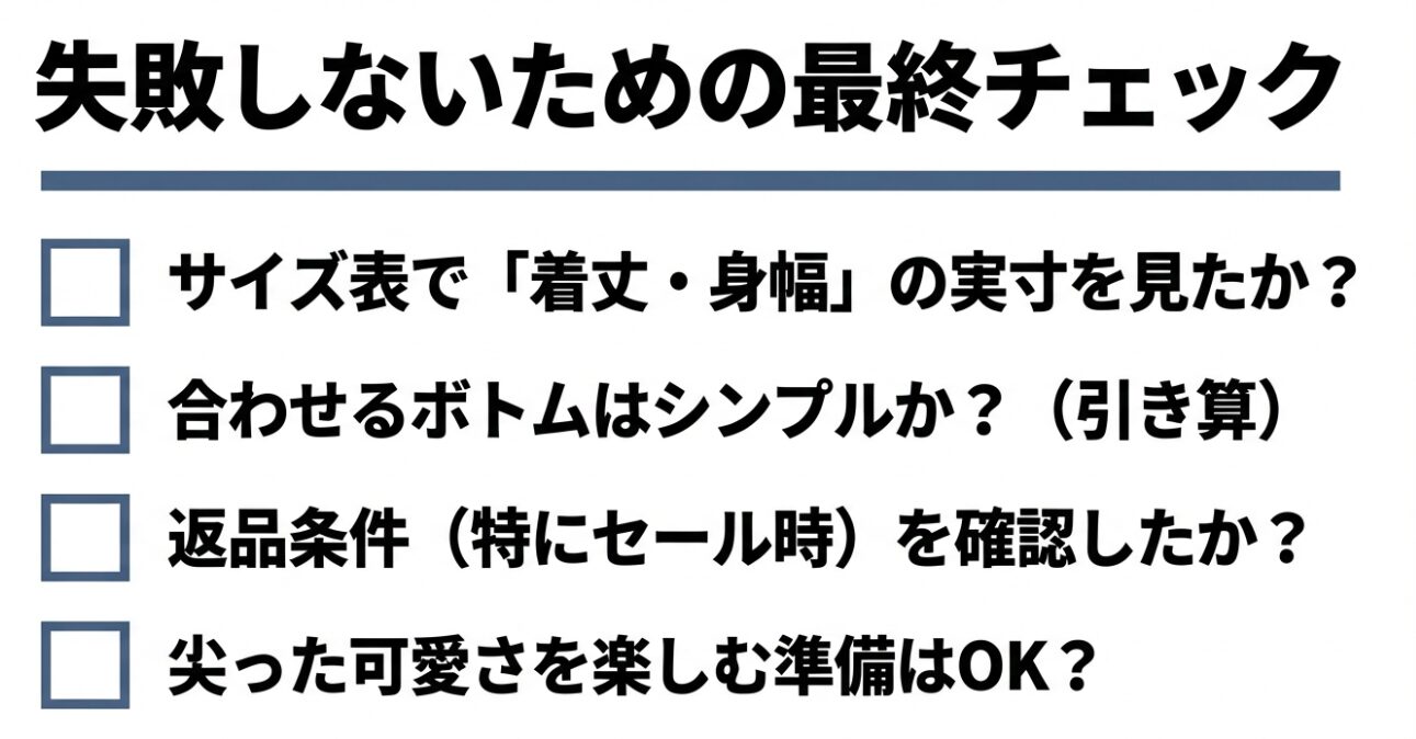最後に、私が「初回で失敗しないために」見るところをまとめます。これはあくまで一般的な目安で、商品や販売先の規定で変わるので、最終確認は必ず購入ページでお願いします。
