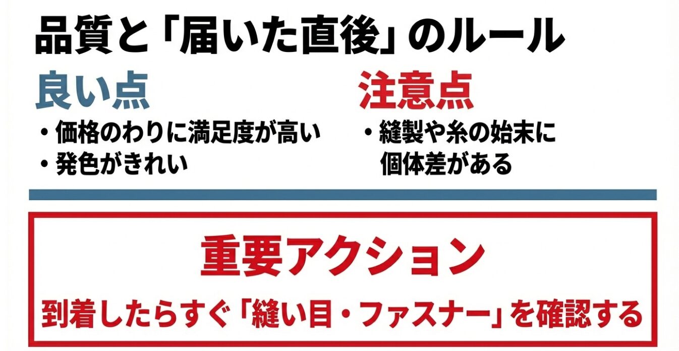 一方で、ネガ寄りの声もゼロではなくて、「縫製の甘さ」や「糸くずっぽいものが付いてた」みたいな軽めの指摘は見かけます。ここは個体差が出やすいところなので、到着したら早めに状態チェックするのが安心です。私は届いた瞬間に、明るい場所で一回広げて、縫い目・刺繍の引っかかり・ボタンやファスナー周りをざっと見ます。これだけでも「返品できる期間」を逃しにくいです。