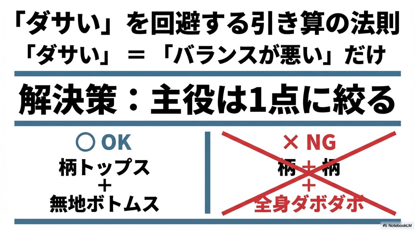 - 主役アイテムは1点に絞る(他は無地で引き算)