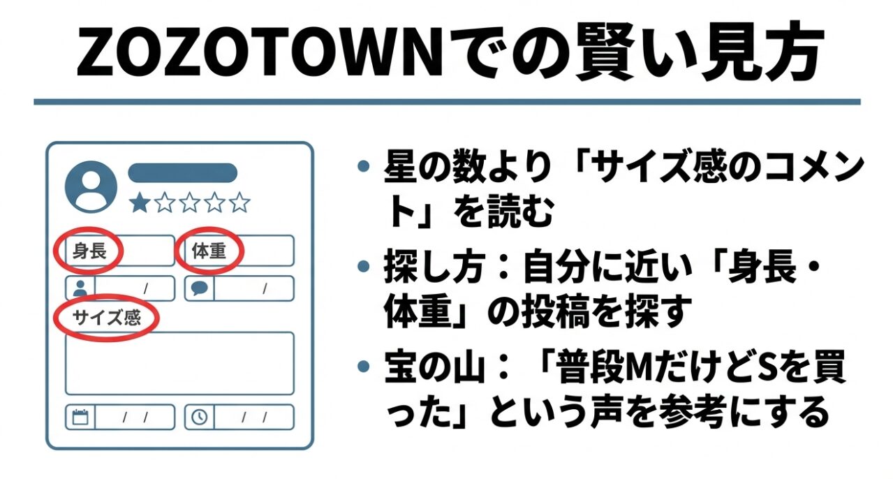 悩んだら、レビューで似た体型の人を探して、着丈・身幅・肩幅のイメージを作る。これだけで、ネット服の成功率はかなり上がります。