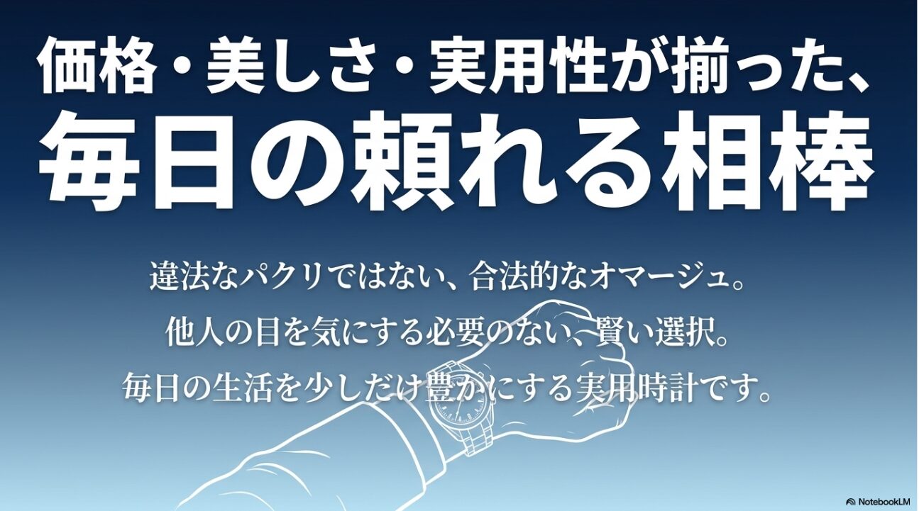 何か不安な点がある場合は、最終的な判断は専門家にご相談ください。しかし、そうした特性や限界をしっかりと理解した上で、「日常の頼れる相棒(ビーターウォッチ)」として選ぶのであれば、これほどコストパフォーマンスに優れた時計はなかなか出会えません。毎日の生活を少しだけ豊かにしてくれる実用時計として、ぜひ前向きに検討してみてはいかがでしょうか。