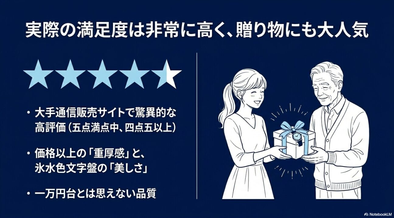 実際に購入した人たちのリアルな声を見てみると、ネット上で囁かれているネガティブな噂とは裏腹に、非常に高い満足度がうかがえます。大手ショッピングサイトのレビューをチェックしてみると、5点満点中で4.5点以上という驚異的な高評価を獲得しているモデルもあるほどです。特に評判が良いポイントとして挙げられるのが、トレンドを的確に押さえた「アイスブルーの文字盤」や、価格以上の重厚感です。「写真で見るよりも実物の方がはるかに美しい」「とても1万円台で買えるクオリティとは思えない」といった、事前の期待値を大きく上回ったという絶賛のコメントが多く寄せられています。