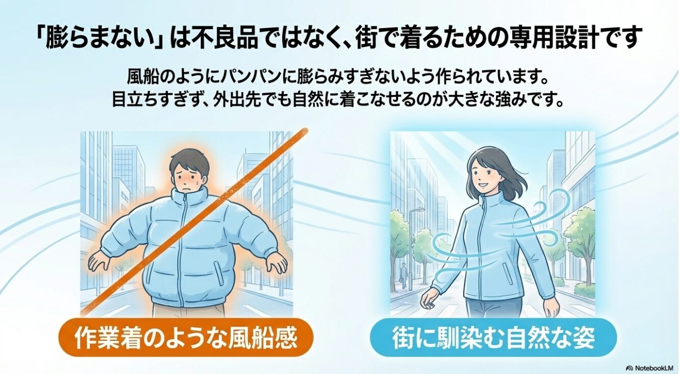 つまり、膨らまない=全部故障とは限らないんですよね。口コミでも「膨らみすぎないから街で着やすい」という好意的な見方があり、見た目を重視する人にはむしろメリットになることもあります。