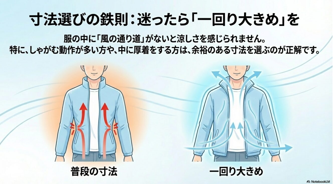 サイズ感はかなり重要です。というのも、空調服は普通の服と違って、中に風が通る空間を確保してこそ性能を発揮しやすいからです。見た目の寸法だけを見るとゆったりしているようでも、実際は裾のゴムがしっかりしていたり、腰回りがややタイトに感じたりして「思ったより小さい」と感じることがあります。