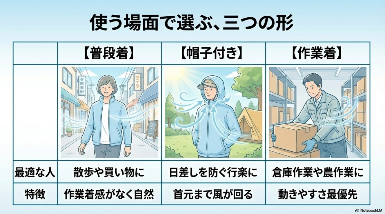 キャンプ、ガーデニング、釣り、スポーツ観戦なら、首や頭まわりに風を回しやすいフード付きが便利ですね。倉庫内作業、DIY、農作業のように実用性を優先したいなら、ワーク系が無難です。見た目より使いやすさを重視したい人にはこちらが合いやすいと思います。つまり、おすすめは1つに決まるというより、用途で変わるという考え方がしっくりきます。口コミが良くても、使う場面がズレると満足度は下がりやすいので、その点は意識して選びたいです。