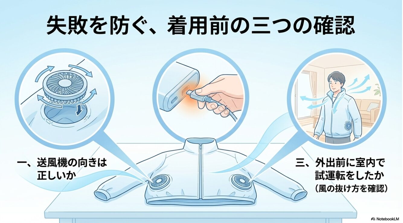 故障対策で大事なのは、いきなり「壊れた」と決めつけないことです。空調服は、実は接続不良や充電不足、ファンの向き違いで動かないことがかなりあります。口コミで「膨らまない」「涼しくない」という話の中にも、設定や装着の問題が混ざっていることが少なくありません。