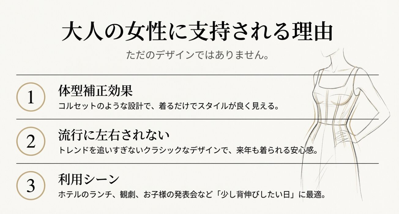 - 体型補正効果:「着るだけでスタイルが良く見える」という口コミが圧倒的多数。加齢による体型の変化を、コルセットのようなパターン設計で美しく整えてくれます。
