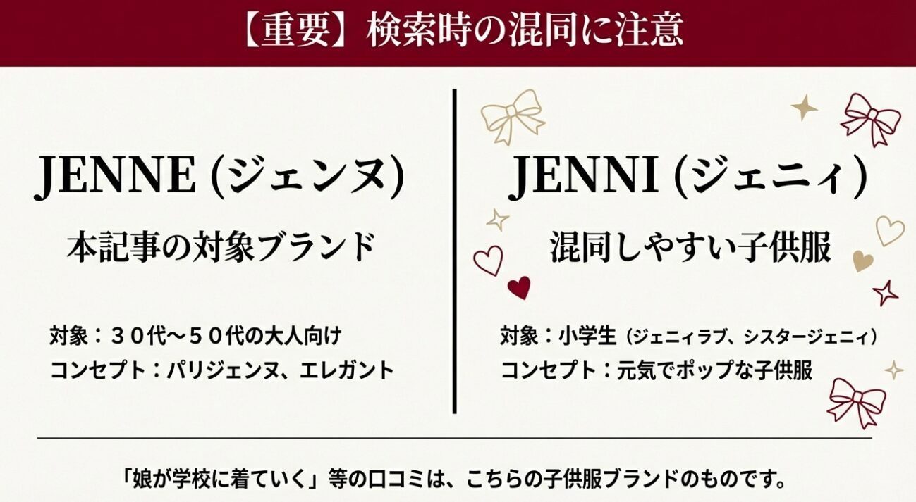 名前のスペルが一文字違い(EとI)で、読み方も似ているため、検索エンジンのサジェスト機能や、自動生成された口コミまとめサイトなどで情報が混ざって表示されることがあります。大人の女性が着るエレガントな服を探している場合は、「JENNE(ジェンヌ)」の情報だけをピックアップするように注意してくださいね。