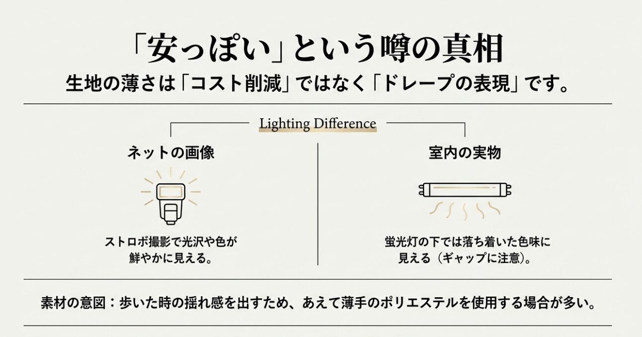 検索候補に出てくる「安っぽい」というキーワード、購入を検討している方にとっては一番気になるポイントですよね。この評価が生まれる背景には、どうやら「通販特有のイメージギャップ」と「生地へのこだわり」のすれ違いがあるようです。