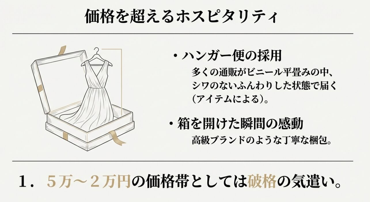 しかし、一方で忘れてはならないのが、JENNEの「梱包」に対する圧倒的な高評価です。多くの通販ブランドがビニール袋に平畳みで配送する中、JENNEは「ハンガー便」を採用し、ふんわりとした状態で届けてくれることが多いです(アイテムによります)。シワのない状態で届き、箱を開けた瞬間のときめきを大切にしている点は、決して「安っぽい」ブランドには真似できないホスピタリティだと感じます。