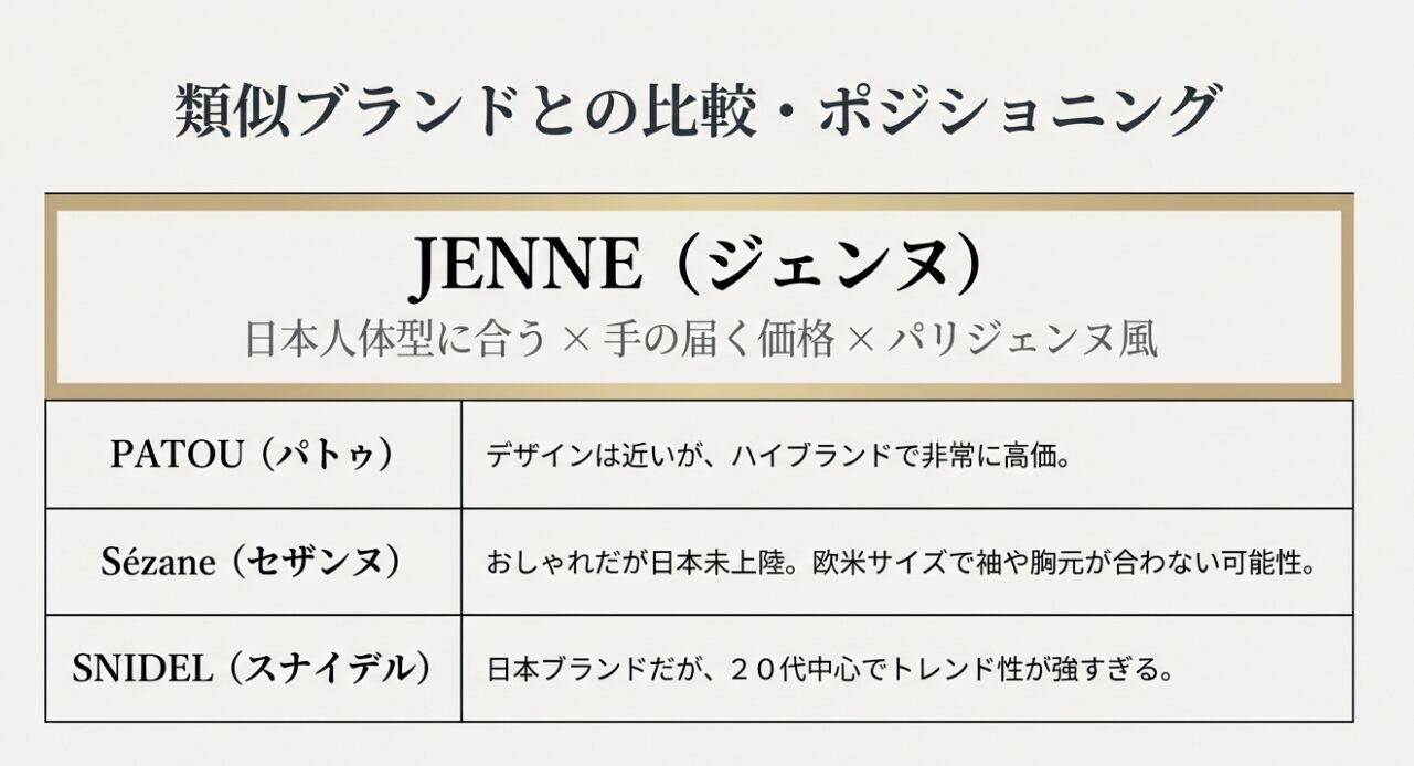 「JENNEの世界観は好きだけど、サイズが合わなかった」「他のブランドとも比較して検討したい」という方のために、よく比較対象に挙がるブランドとの違いを整理してみました。それぞれに魅力がありますが、JENNEの立ち位置は非常にユニークです。