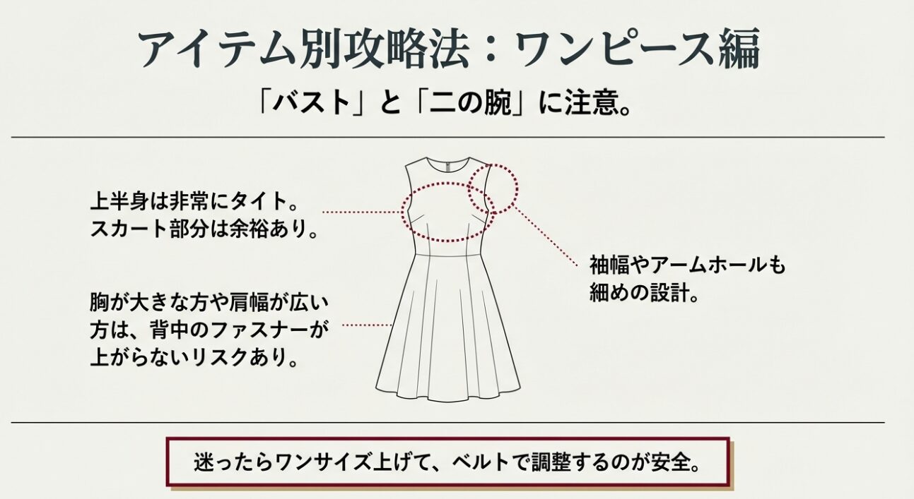 ブランドの代名詞とも言えるフィット&フレアのワンピースですが、選ぶ際に特に注意したいのが「バスト」と「二の腕」のサイズです。スカート部分はたっぷりと布を使ったフレアシルエットのため、ヒップや太もも周りには余裕があることが多いですが、上半身はかなりタイトな設計になっていることが一般的です。