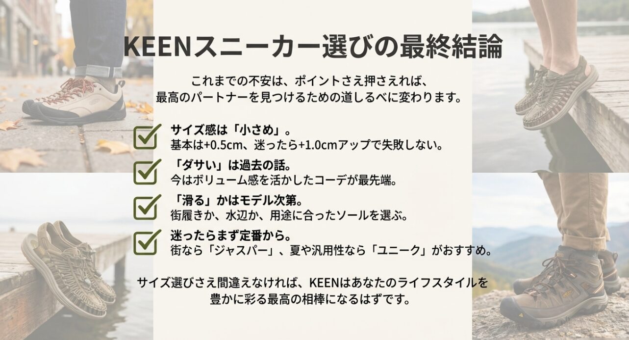 ここまで「KEEN スニーカー 口コミ」というキーワードを軸に、様々な角度からKEENの魅力を検証してきました。改めて重要なポイントをまとめます。
