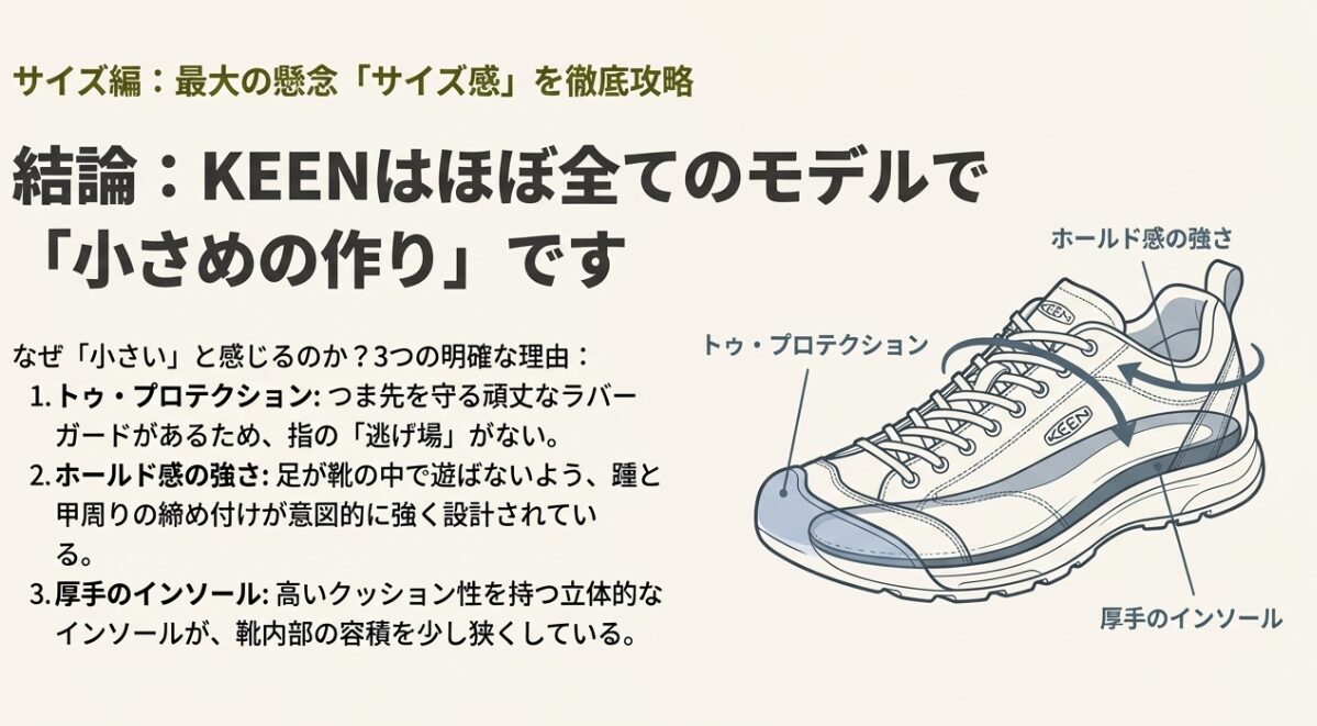 KEENの購入を検討する際、最も高いハードルとなり、かつ最も多くのユーザーが口を揃えて指摘するのが「サイズ感の難しさ」です。結論をはっきり申し上げますと、KEENのスニーカーは、ほぼ全てのモデルにおいて「小さめの作り」になっています。