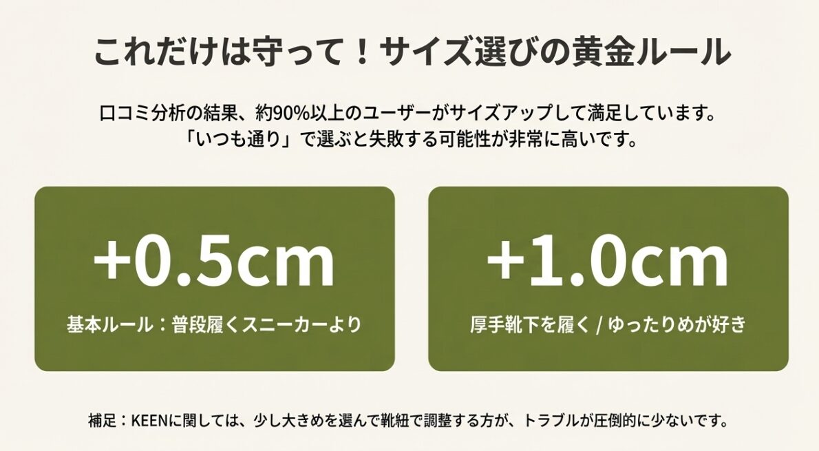 - 基本ルール:普段のナイキやアディダスより「+0.5cm(ハーフサイズアップ)」を選ぶ。