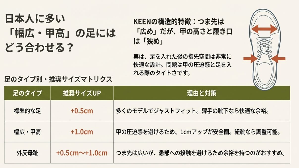 しかし、ここで注意が必要です。「幅が広いならサイズアップしなくていいのでは?」と思うかもしれませんが、問題は「甲の高さ」と「履き口」です。前述した通り、KEENは足をしっかり固定するために、甲部分の高さが低めに抑えられており、履き口もタイトなモデルが多いのです。