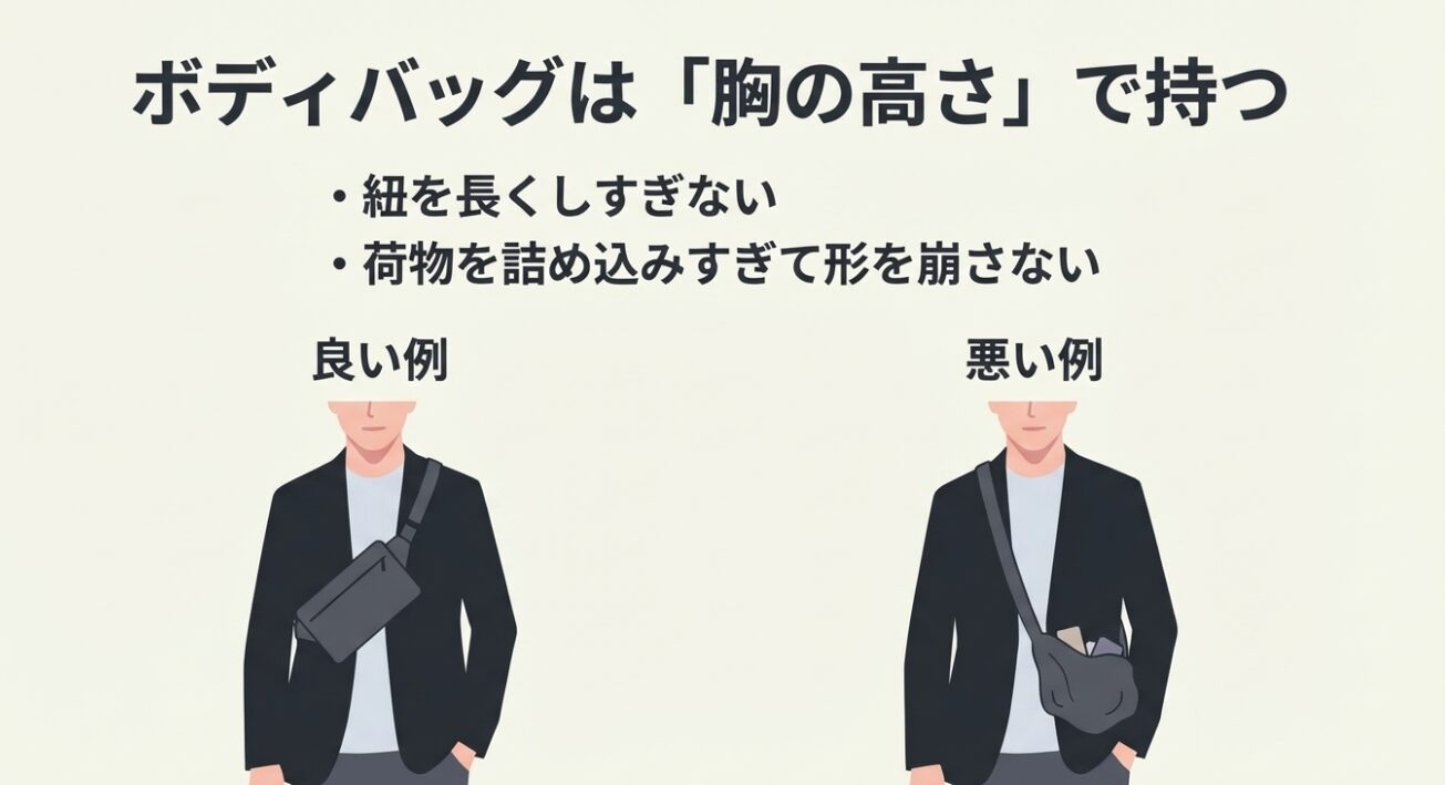 持ち方の注意:ストラップを必要以上に長くしてだらんと下げると、だらしなく見えやすいです。鏡で「胸の高さ」に来るくらいに調整すると、見た目も取り回しも安定します。