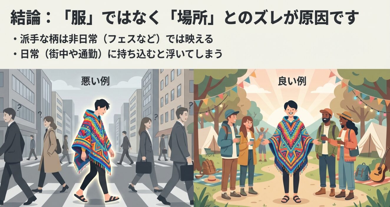 私の小技:柄ポンチョが不安な日は、インナーとボトムを同系色でまとめて「柄の面積」を小さく見せます。写真で見た時にガチャガチャしないのでおすすめです。
