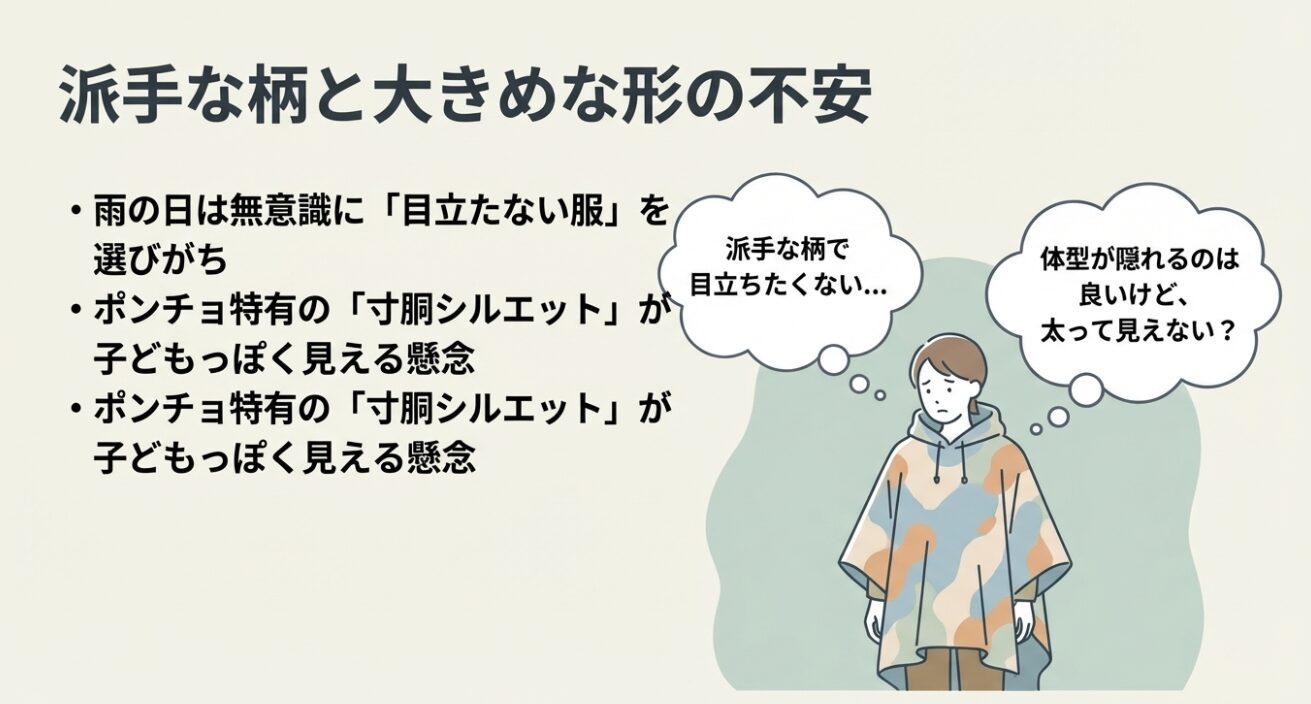それにポンチョ特有のオーバーシルエットも心理に効きます。体型を拾わないのはメリットですが、反面「寸胴に見えない?」「子どもっぽくならない?」と心配になりやすいです。だからこそ、買う前にKiUがダサいのか検索して、似合う人の条件を確認したくなるんだと思います。