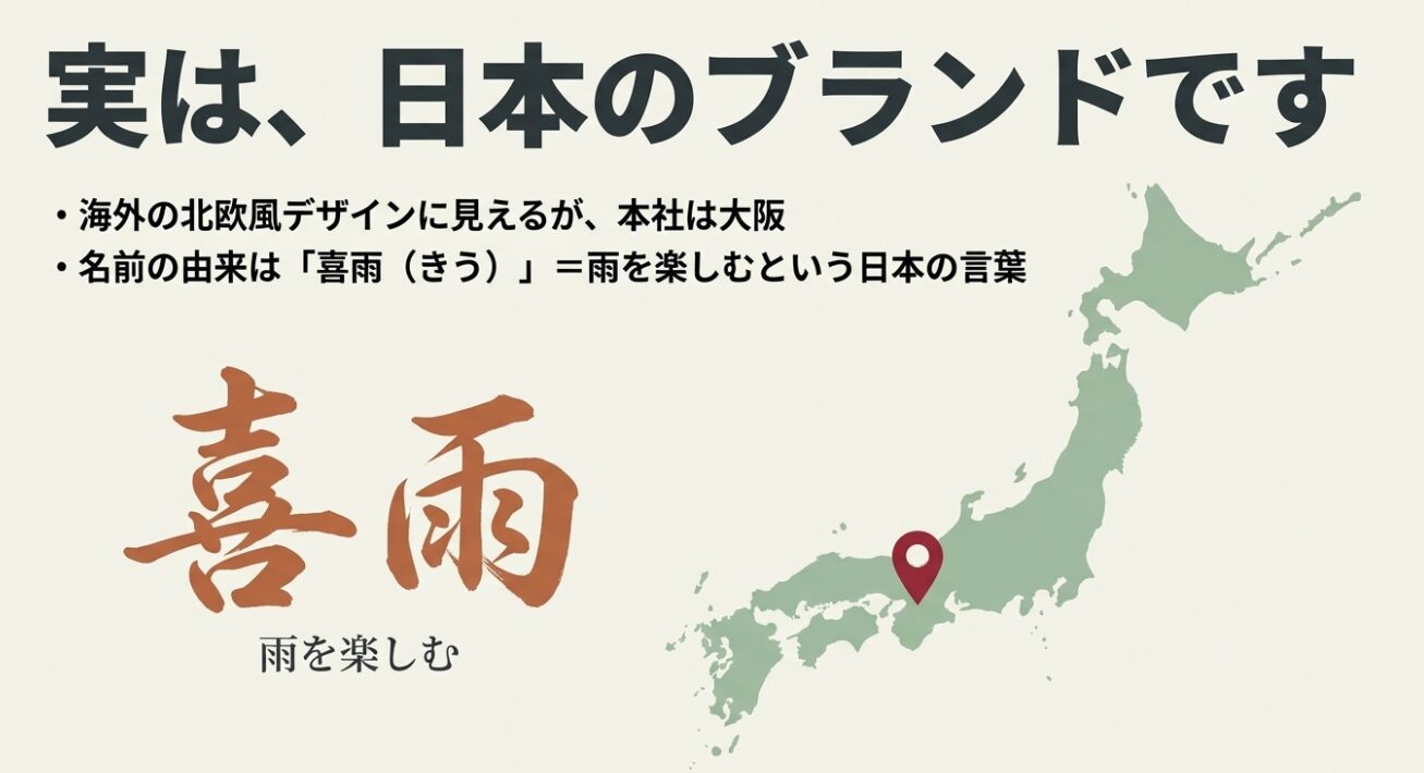 ただ、運営しているのは大阪に本社を置くレイングッズ企業で、傘やレインウェアを長く作ってきた会社です。ブランドとしては「雨の日を楽しむ」「外遊びを後押しする」みたいなメッセージが強くて、言葉の響きも日本的。雨を前向きに捉える“喜雨”のニュアンスが根っこにあるのが、個人的には好きなところです。