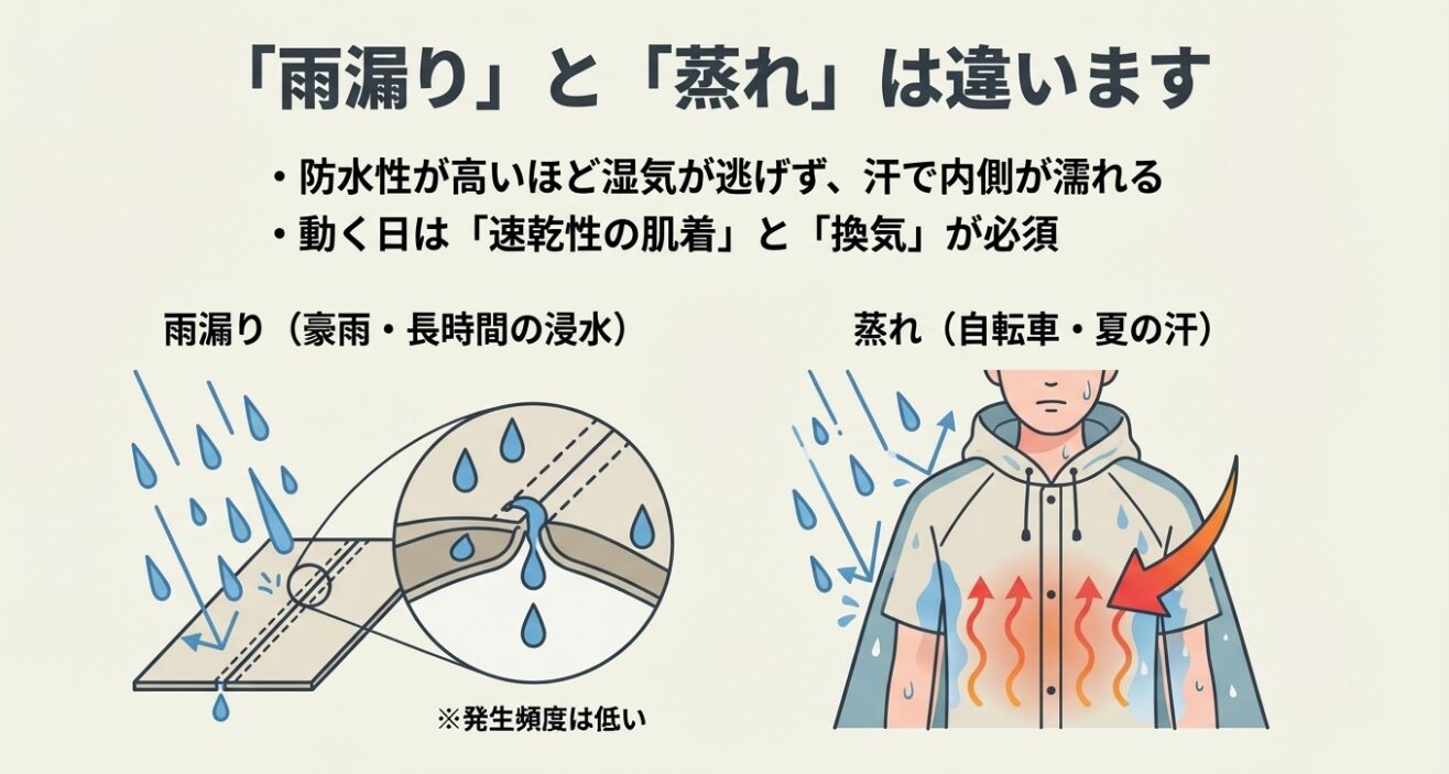 「雨漏り」と「蒸れる」は、体感が混ざって誤解が起きやすいポイントです。ここを切り分けるだけで不安がかなり減ります。