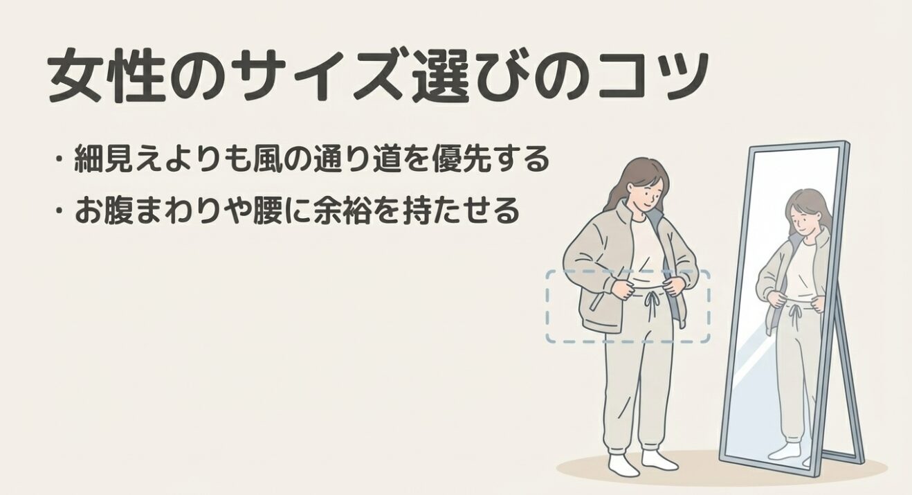 | レディースで重ね着想定 | 1サイズ上も検討して空間を確保 | ファン装着でお腹まわりが窮屈 |
